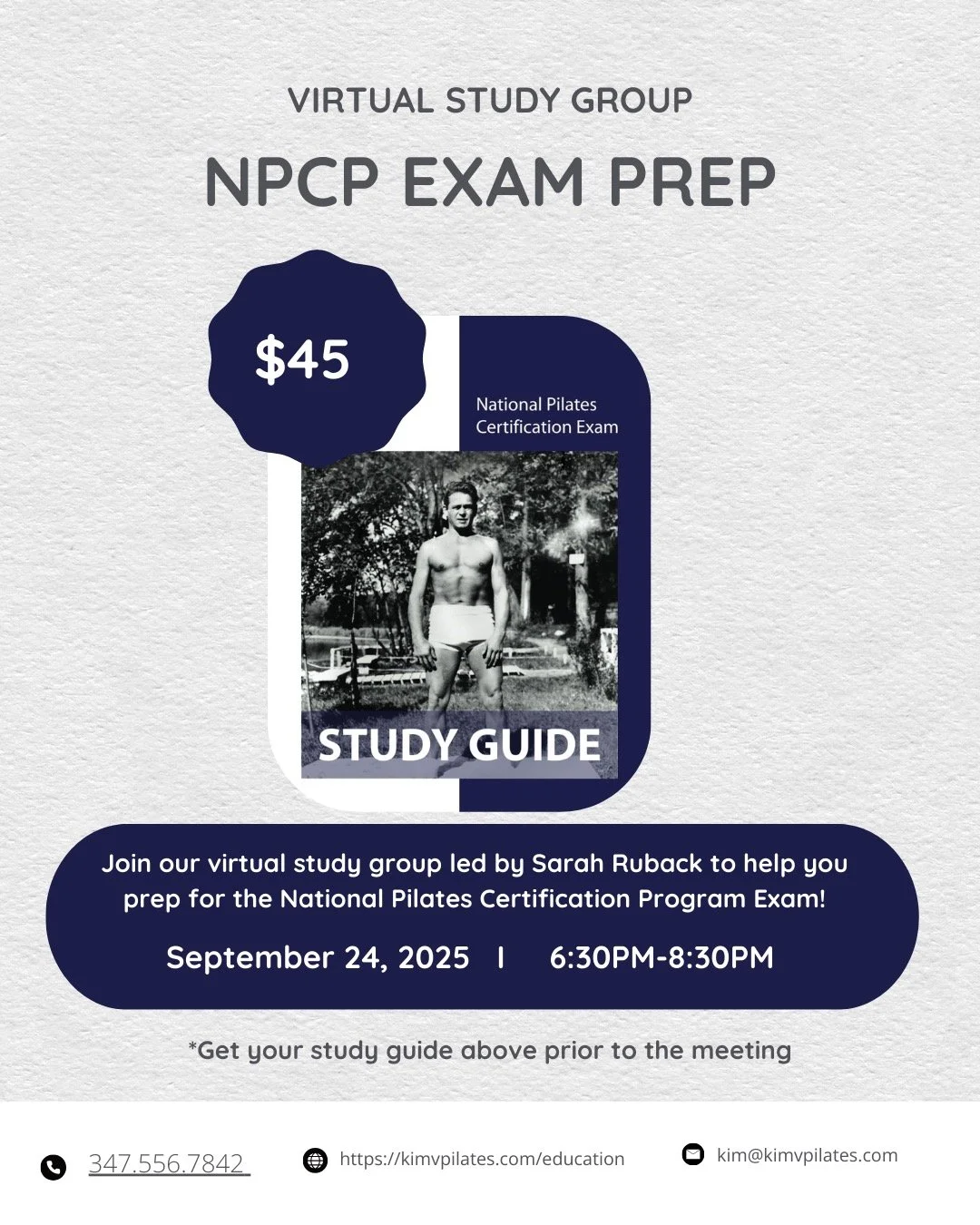 Get ready to tackle the National Pilates Certification Program (NPCP) in this lively, instructor-focused 2-hour workshop — delivered live on Zoom. We’ll demystify NPCP expectations and exam format, review key movement principles and assessment expectations, and arm you with practical study strategies and a realistic study plan. You’ll take two timed quizzes in real time (no hiding — quiz face on!), then we’ll review the answers together so you know exactly what to polish before exam day. Please purchase the required NPCP prep book from Amazon in advance. Ideal for Pilates instructors planning to apply for NPCP certification — leave feeling more confident, focused, and ready to apply.